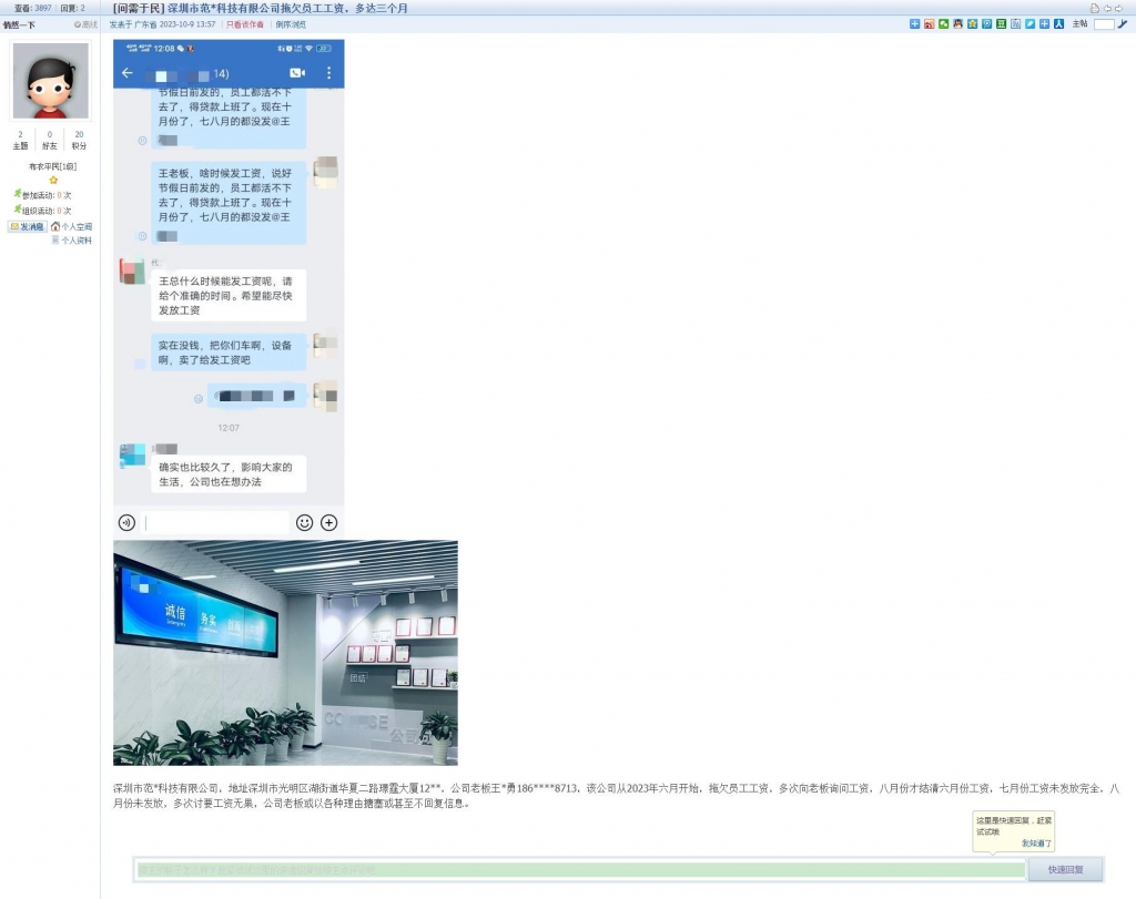 1、帖文《深圳市范*科技有限公司拖欠员工工资,多达三个月》