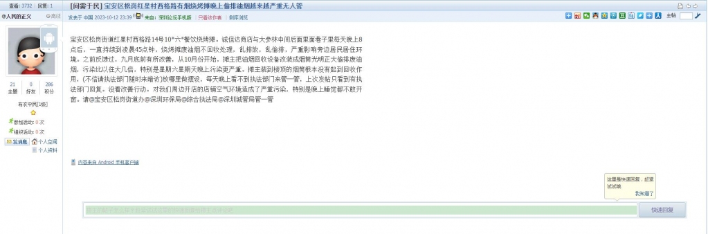 10、帖文《宝安区松岗红星村西格路有烟烧烤摊晚上偷排油烟越来越严重无人管》