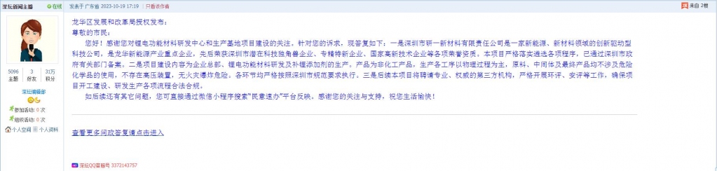 一是深圳市研一新材料有限责任公司是一家新能源、新材料领域的创新驱动型科技公司,是龙华新能源产业重点企业,先后荣获专精特新企业、国家高新技术企业等各项荣誉资质。本项目严格落实遴选各项程序,已通过深圳市政府有关部门备案。二是项目建设内容为企业总部、锂电功能材料研发及补锂添加剂的生产。产品为非化工产品,生产各工序以物理过程为主,原料、中间体及最终产品均不涉及危险化学品的使用,不存在高压装置,无火灾爆炸危险。各环节均严格按照深圳市规范要求执行。三是后续本项目将聘请专业、权威的第三方机构,严格开展环评、安评等工作,确保项目开工建设、研发生产各项流程合法合规。