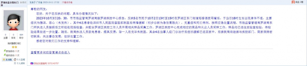 2023年10月3日20:30,市市场监管局罗湖局接罗湖疾控中心报告:反映5名市民于10月2日13时至15时在罗湖区东门街道稻香酒家用餐后,于当日18时左右出现身体不适,主要症状为腹泻、恶心(未发热),其中4名患者赴深圳市人民医院留医部就医后病情缓解(初步诊断为急性胃肠炎),无重症和死亡病例。按照应急处置流程,市场监督管理局罗湖局东门所执法人员接报后立即赶赴现场检查,并配合罗湖区疾控工作人员开展相关样品采集工作。罗湖区疾控中心完成相应的菜品和从业人员采样工作,样品均已送往实验室检验,待检验结果作进一步处置。随后,我局执法人员致电患者,据其反馈:除一人在龙华未就医,其余4名当事人经门诊治疗后症状缓解已返回家中。后续我局将继续与疾控部门、商家保持密切联系,关注事态发展,做好处置工作。
