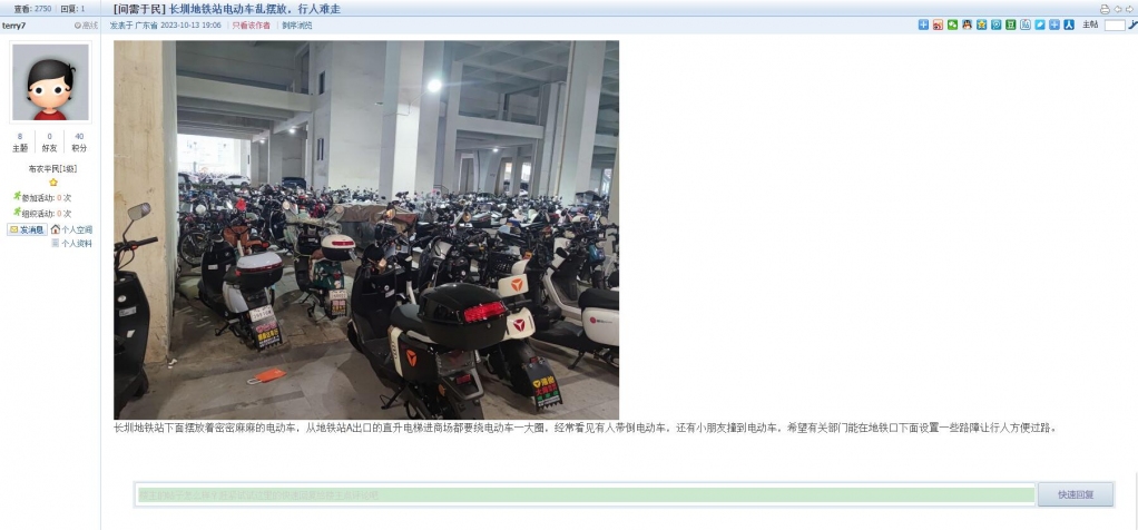 13、帖文《长圳地铁站电动车乱摆放,行人难走》