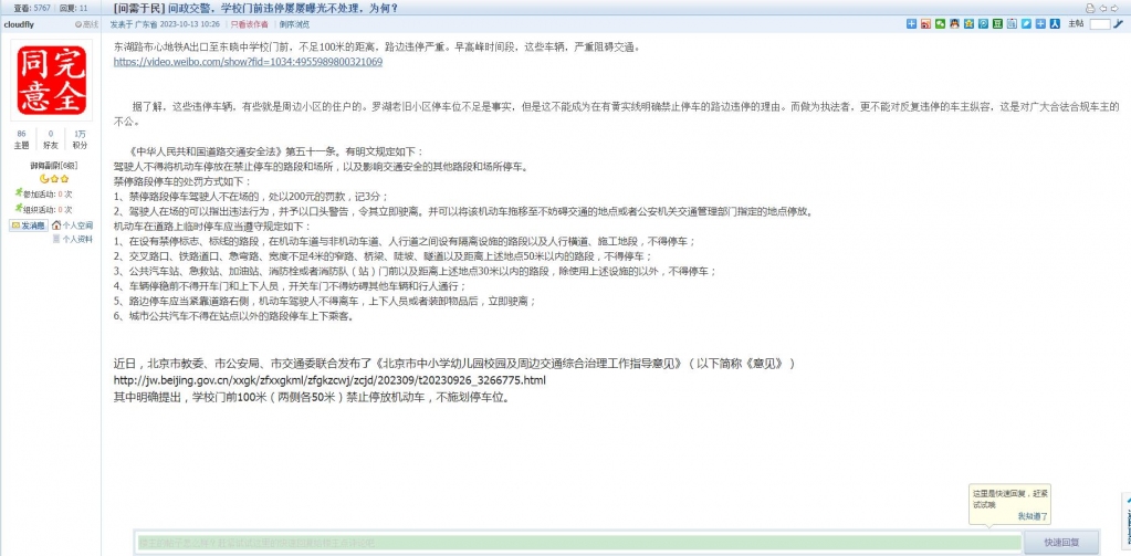 11、帖文《问政交警,学校门前违停屡屡曝光不处理,为何?》