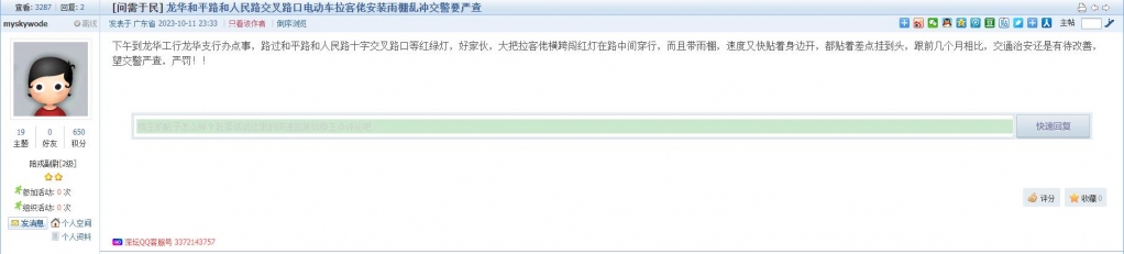 15、帖文《龙华和平路和人民路交叉路口电动车拉客佬安装雨棚乱冲交警要严查》