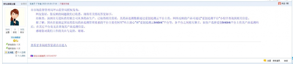 经核查,深圳市天道医药有限公司从事药品生产,已取得相关资质,其药品追溯数据通过爱创追溯云平台上传,网络反映的产品可通过“爱创追溯平台”小程序查询到相关信息。
