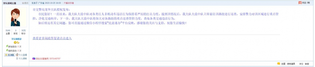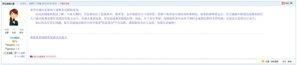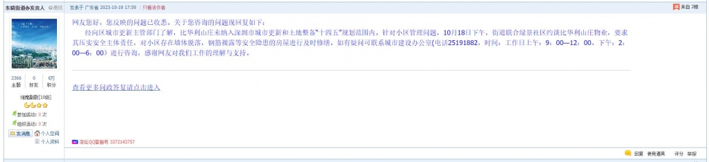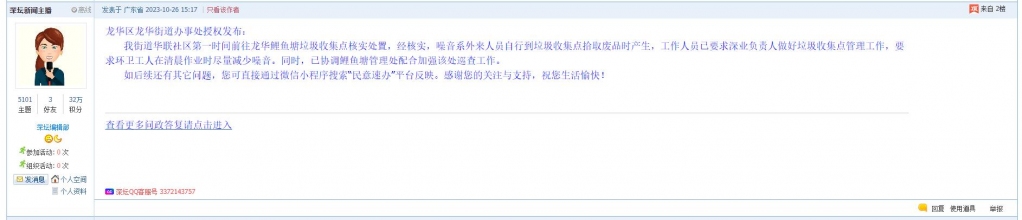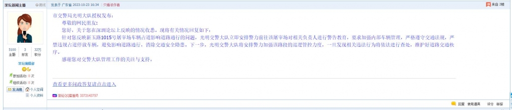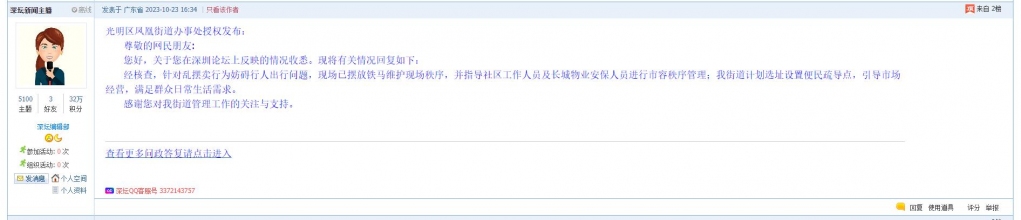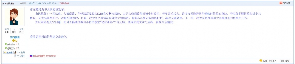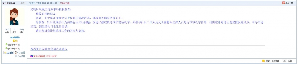 各职能单位如需对网友反映的问题进行回应,可在深圳论坛注册官方账号并通过认证,回帖进行回应。