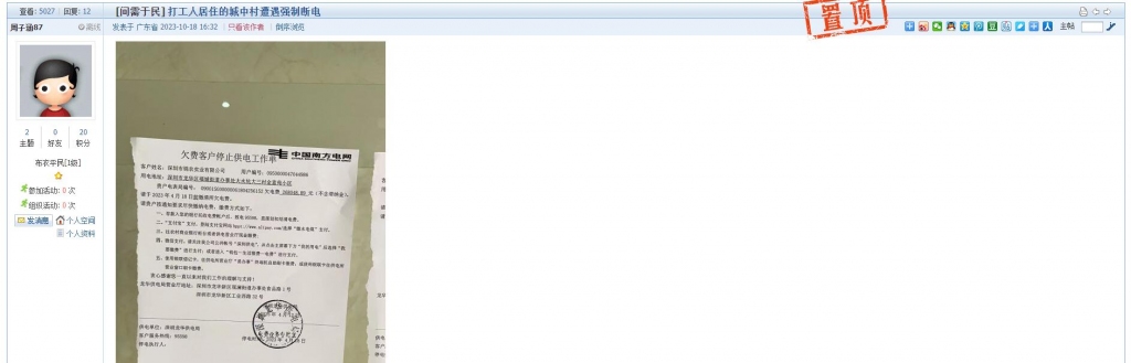 12、帖文《打工人居住的城中村遭遇强制断电》