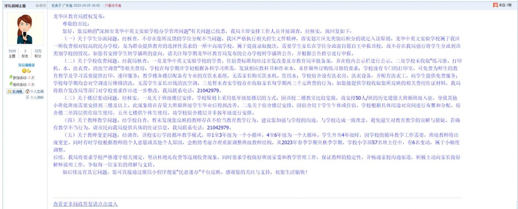 您好,您反映的“深圳市龙华中英文实验学校办学管理问题”有关问题已收悉,我局立即安排工作人员开展调查,经核实,现回复如下: