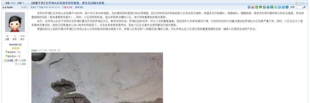 1、帖文《比华利山庄房屋老旧存隐患,建议启动城市更新》