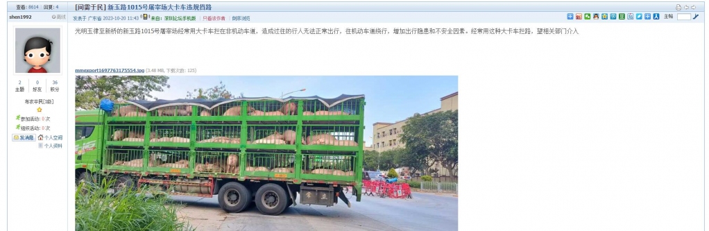 4、帖文《新玉路1015号屠宰场大卡车违规挡路》