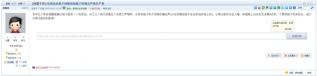 14、帖文《垃圾站凌晨不间断的扔瓶子的撞击声扰民严重》