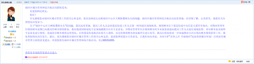 首先感谢您对福田区城市管理工作的关心和支持,您在深圳论坛反映福田中心区大树惨遭剃光头的问题,福田区城市管理和综合执法局高度重视,经详细了解,认真研究,现就有关办理情况回复如下: