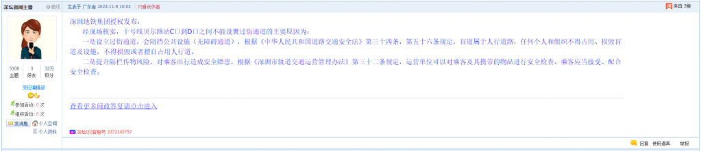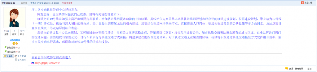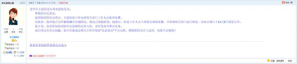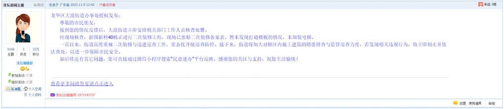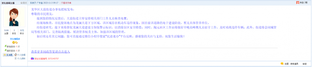 各职能单位如需对网友反映的问题进行回应,可在深圳论坛注册官方账号并通过认证,回帖进行回应。