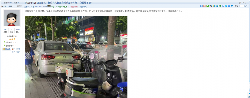 15、帖文《极度自私,把公共人行道变成私家停车场,交警管不管?》