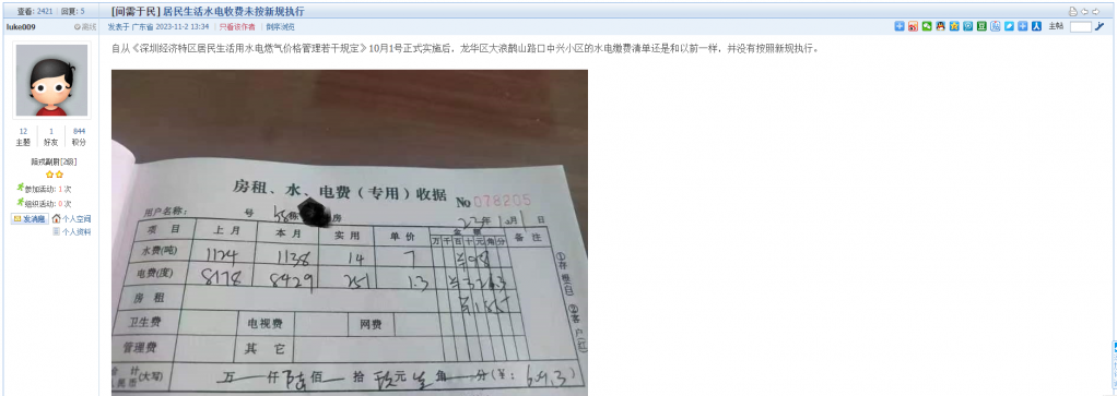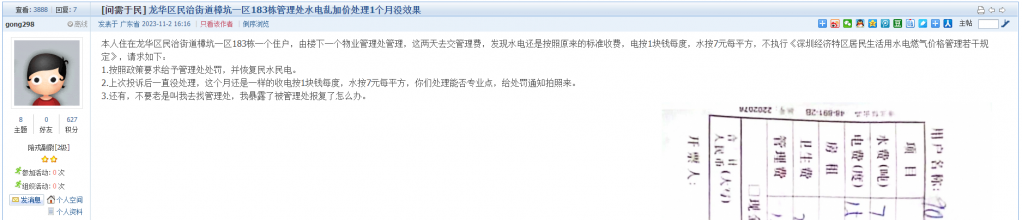 18、帖文《龙华区民治街道樟坑一区183栋管理处水电乱加价处理1个月没效果》