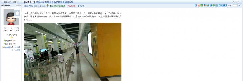 13、帖文《10号线贝尔路地铁站安检通道隔离问题》