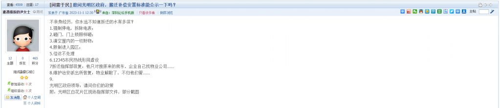 5、帖文《敢问光明区政府,搬迁补偿安置标准能公示一下吗?》