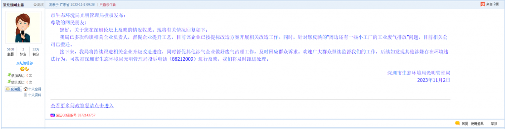 接下来,我局将持续跟进相关企业升级改造进度,同时督促其他涉气企业做好废气治理工作,及时回应群众诉求。欢迎广大群众继续监督我们的工作,后续如发现其他涉嫌存在环境违法行为,可拨打深圳市生态环境局光明管理局投诉电话(88212009)进行反映,我们将及时跟进处理。