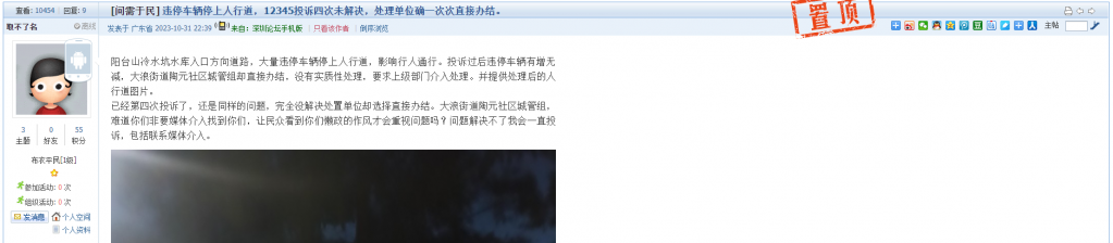 8、帖文《违停车辆停上人行道,12345投诉四次未解决,处理单位确一次次直接办结》