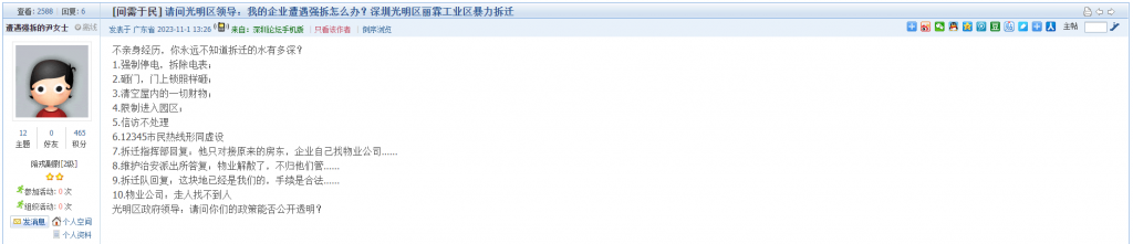 11、帖文《请问光明区领导:我的企业遭遇强拆怎么办?深圳光明区丽霖工业区暴力拆迁》