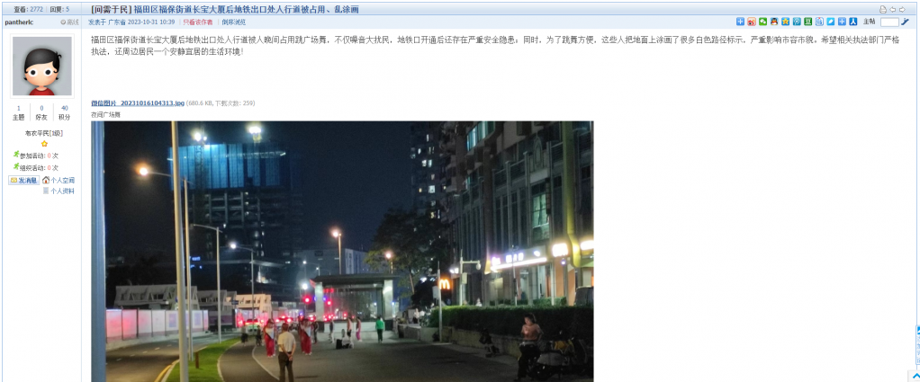4、帖文《福田区福保街道长宝大厦后地铁出口处人行道被占用、乱涂画》