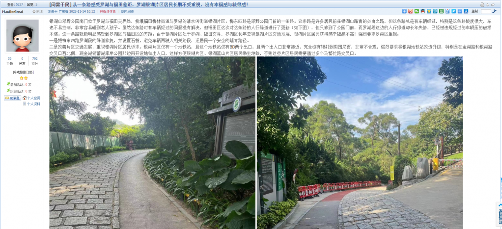 6、帖文《从一条路感受罗湖与福田差距,罗湖银湖片区居民长期不受重视,没有幸福感与获得感!》