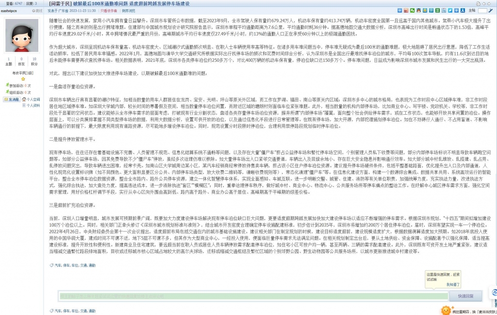 据统计,2023年11月20日-11月26日,网友在深圳论坛发布问政类帖文共47篇,得到相关单位正式回应的帖文数为19篇。