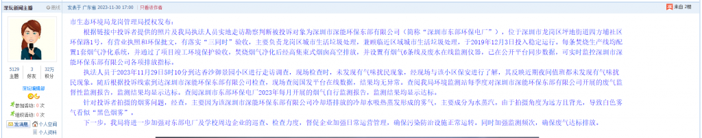 根据链接中投诉者提供的照片及我局执法人员实地走访勘察判断被投诉对象为深圳市深能环保东部有限公司(简称“深圳市东部环保电厂”),位于深圳市龙岗区坪地街道四方埔社区环保路1号,有营业执照和环保批文,有落实“三同时”验收,主要负责龙岗区城市生活垃圾处理,兼顾临近区域城市生活垃圾处理,于2019年12月3日投入稳定运行。每条焚烧生产线均配置1套烟气净化系统,并通过了项目竣工环境保护验收,焚烧烟气净化后经高集束式烟囱高空排放,并设置有烟气6条线及废水在线监测仪器,已在公开平台同步数据,可实时监控深圳市深能环保东部有限公司各项排放指标。