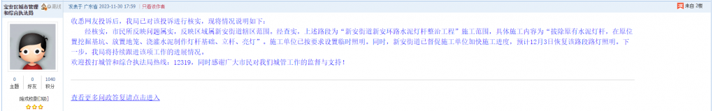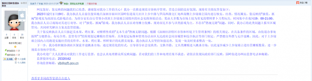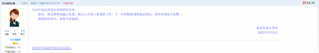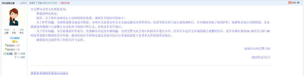各职能单位如需对网友反映的问题进行回应,可在深圳论坛注册官方账号并通过认证,回帖进行回应。