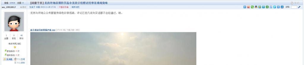 3、帖文《龙岗坪地深圳科学高中龙岗分校附近经常有难闻臭味》