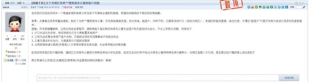 5、帖文《关于光明区兆邦**慧苑商务公寓的落户问题》