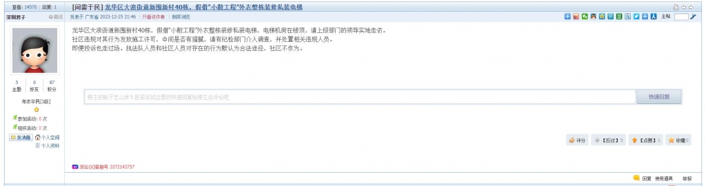 3、帖文《龙华区大浪街道新围新村40栋,假借“小散工程”外衣整栋装修私装电梯》