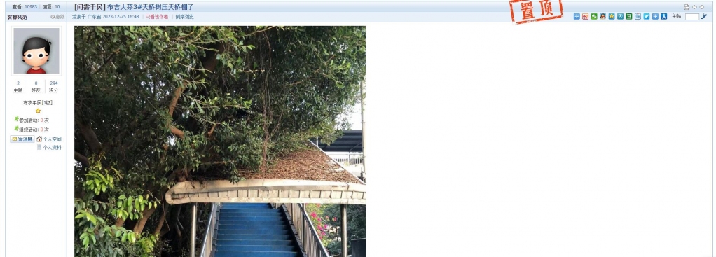 2、帖文《布吉大芬3#天桥树压天桥棚了》
