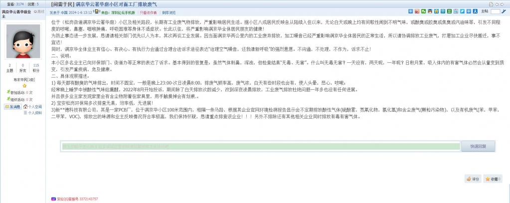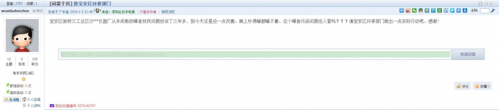 1、帖文《新桥第三工业区沙**仪器厂噪音扰民》