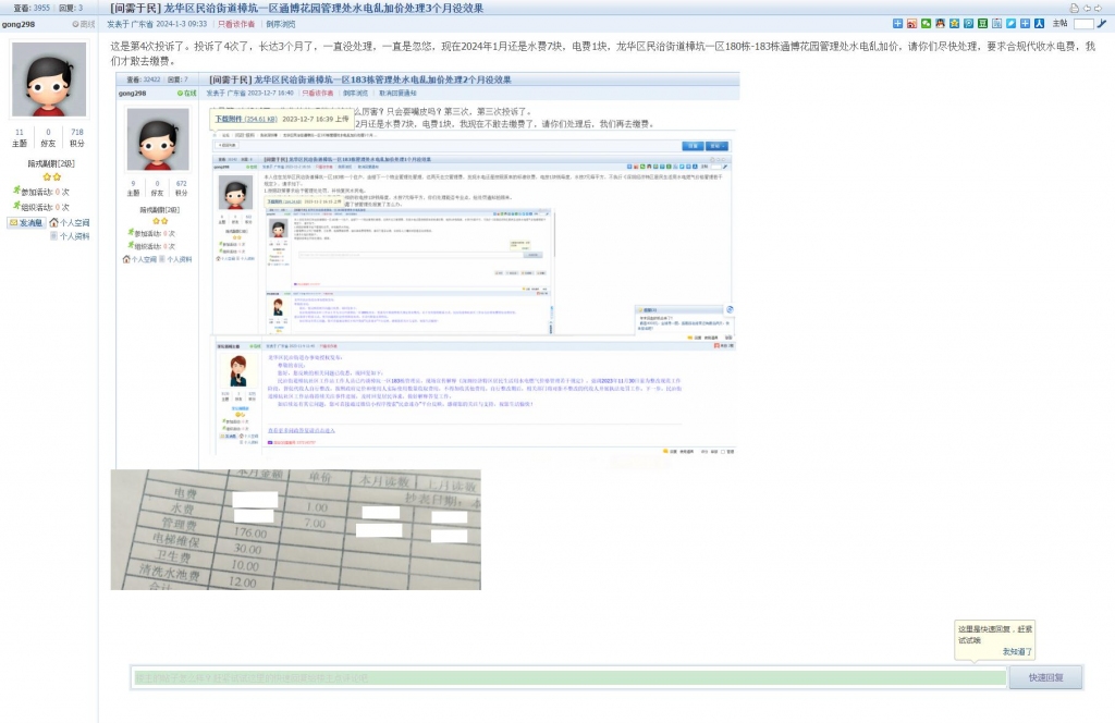 3、帖文《龙华区民治街道樟坑一区通博花园管理处水电乱加价处理3个月没效果》