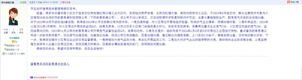 经查,满京华云著华庭小区位于宝安区松岗街道松岗沙浦工业片区内,东侧临近燕罗街道,北侧为松福大道,南侧与西侧为工业区,于2023年8月起交付。群众主要投诉对象为小区南侧50米处深圳市新泰思德科技有限公司(下称新泰思德公司)。该公司于2011年成立,已依法取得环评批复和排污许可证,主要从事线路板生产,配有废气污染防治设施35套,并于2023年10月升级改造8套设施。我局自2023年11月收到群众有关投诉后,一是迅速排查,对小区周边开展地毯式检查,形成涉气企业清单,明确治理对象。二是科学监测,2023年11至2024年1月期间,对小区周边开展走航监测6次,结果无异常;12月25日在小区南门安装恶臭分析仪,目前未发现异常;采集周边重点企业废气2份、小区周边无组织废气3份,监测结果均达标;2023年11月以来对新泰思德公司开展废气监督性监测4次,结果均达标。三是优化提升,组织专家于2024年1月4日至5日对周边工业园进行突检,重点督促新泰思德公司进一步封闭车间窗户、优化废气处理设施、加盖废水池等,现该公司已完成整改。四是加强沟通,建立群众沟通微信群,上门走访170余户,每晚安排巡查,及时响应群众诉求。下一步,我局将加强对小区周边企业的日常监督管理。一是持续加大废气监测力度,常态化开展监测工作。二是加大对涉气企业的指导帮扶力度,推动相关企业的深度治理。三是坚持每日安排专人巡查小区周边区域,发现问题及时解决。四是联合属地街道相关部门,共同推进问题化解。