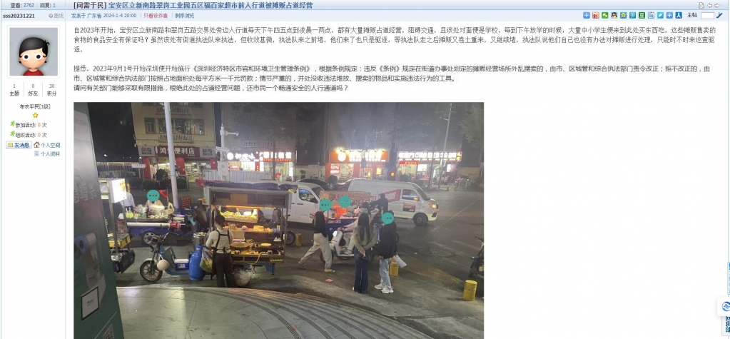 5、帖文《宝安区立新南路翠岗工业园五区福百家超市前人行道被摊贩占道经营》