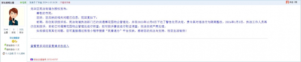 各职能单位如需对网友反映的问题进行回应,可在深圳论坛注册官方账号并通过认证,回帖进行回应。