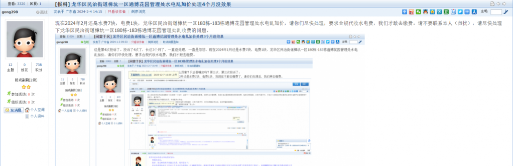 9、帖文《龙华区民治街道樟坑一区通博花园管理处水电乱加价处理4个月没效果》