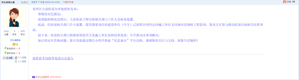各职能单位如需对网友反映的问题进行回应,可在深圳论坛注册官方账号并通过认证,回帖进行回应。