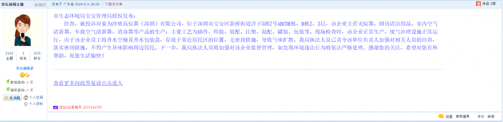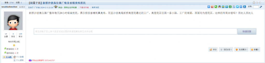 5、帖文《新桥沙彼高仪器厂噪音香精臭味扰民》