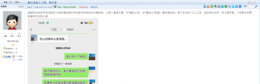 3、帖文《中电建*局恶意拖欠工人工资,言而无信!》