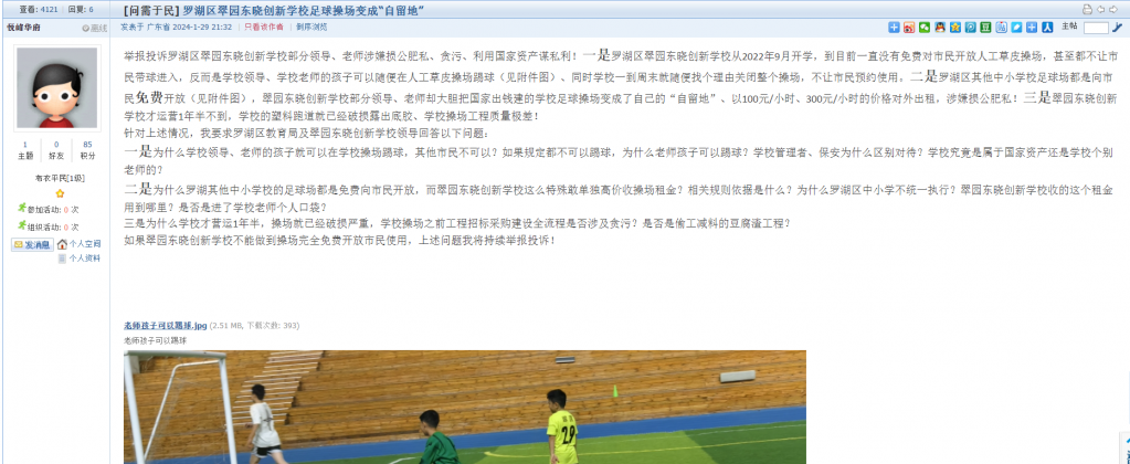 2、帖文《罗湖区翠园东晓创新学校足球操场变成“自留地”》