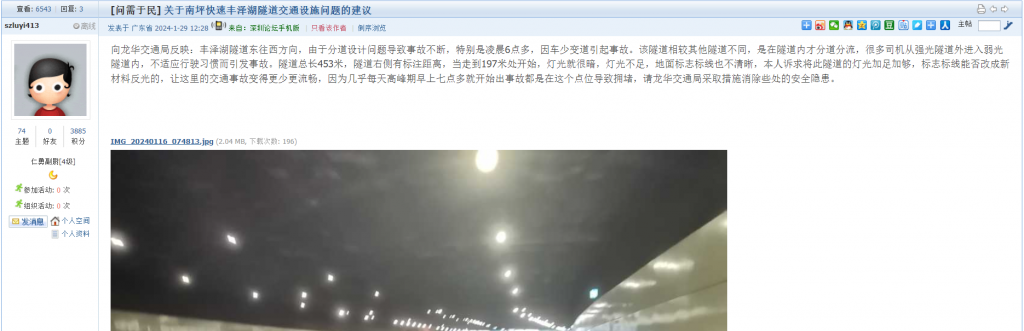 1、帖文《关于南坪快速丰泽湖隧道交通设施问题的建议》