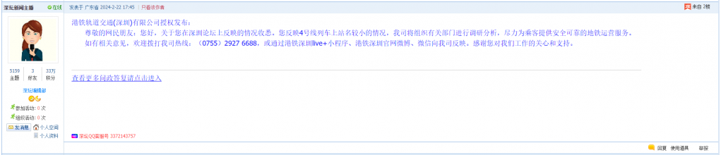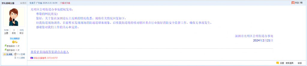 各职能单位如需对网友反映的问题进行回应,可在深圳论坛注册官方账号并通过认证,回帖进行回应。