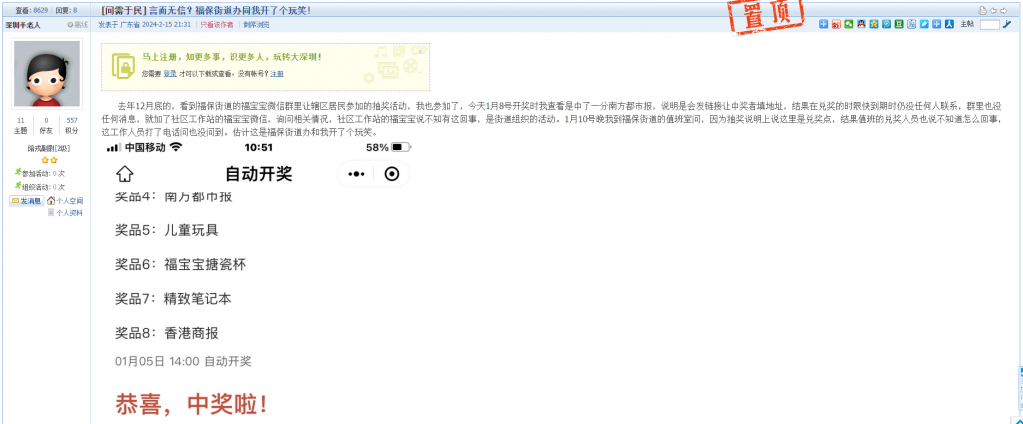 1、帖文《言而无信?福保街道办同我开了个玩笑!》