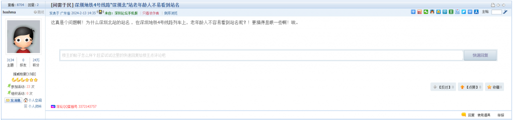 3、帖文《深圳地铁4号线路“深圳北”站老年龄人不易看到站名》