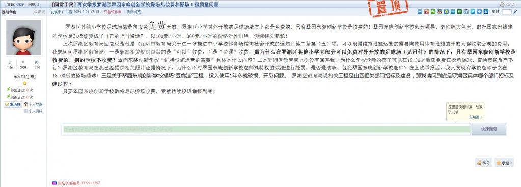 3、帖文《再次举报罗湖区翠园东晓创新学校操场乱收费和操场工程质量问题》