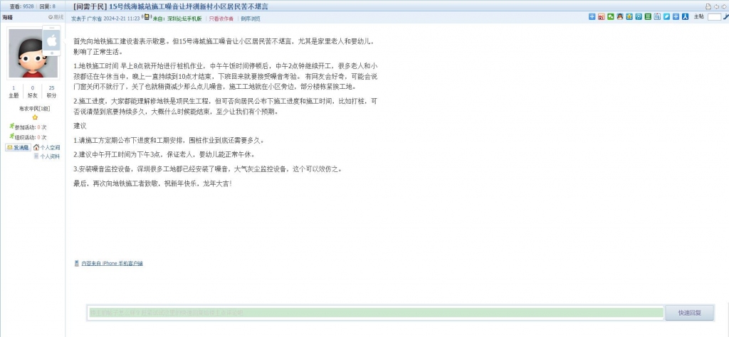 2、帖文《15号线海城站施工噪音让坪洲新村小区居民苦不堪言》