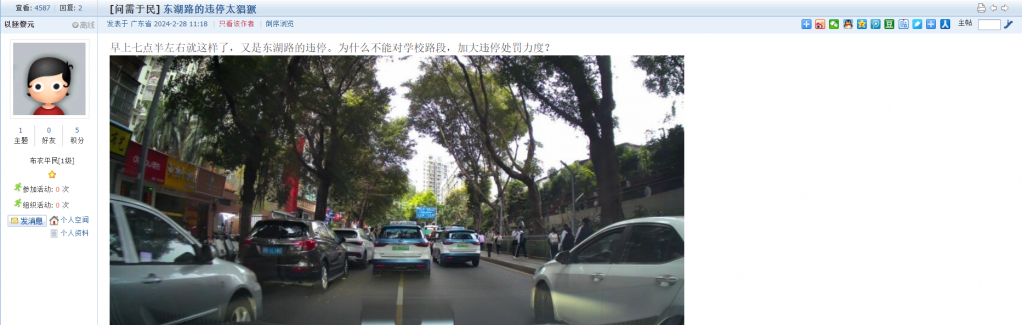 9、帖文《龙华德逸公园西门前长期停放十多辆僵尸车 影响出入》