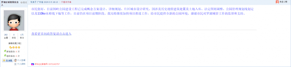 我局将继续加快项目推进工作,给市民提供全新的公园环境。感谢市民对罗湖城管工作的监督和支持。